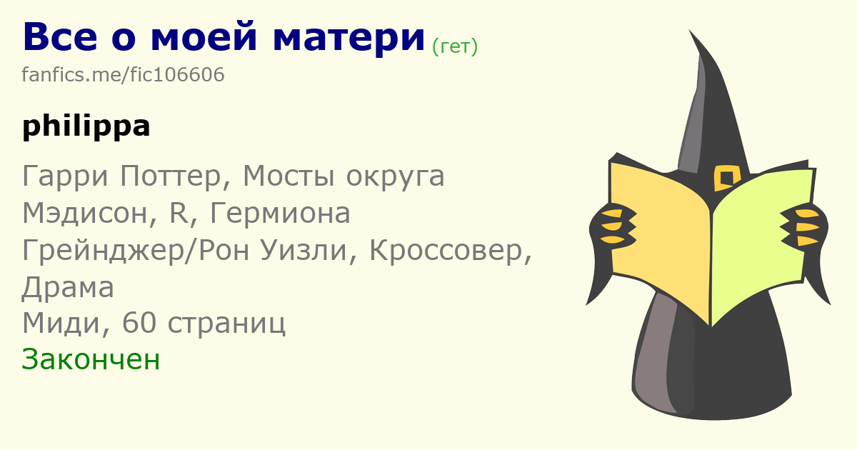 | Здравствуйте! На фанфиксе теперь есть фандом «Мосты округа Мэдисон» (https://fanfics-ib.ru/fandom1372), можно красиво оформить шапку, пусть и частичный кроссовер 1 | |